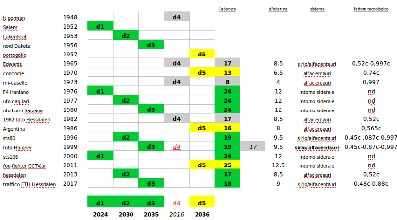- Esiste un "trenino di 4 navi astrali aliene" che hanno generato una latenza ufologica che ha un massimo di 24 anni ,e che gradualmente si contrae sino ad un minimo di 17 anni. Se queste tre navi hanno fatto perno su Alfacentauri/Sirio, allora tali vascelli astrali sono stati gradualmente aggiornati, UPGRADANDONE le velocità. In alternativa, hanno sempre fatto perno, su una base di prossimità aliena non superiore a 12AL mutando la loro velocità per ragioni non tecnologiche.